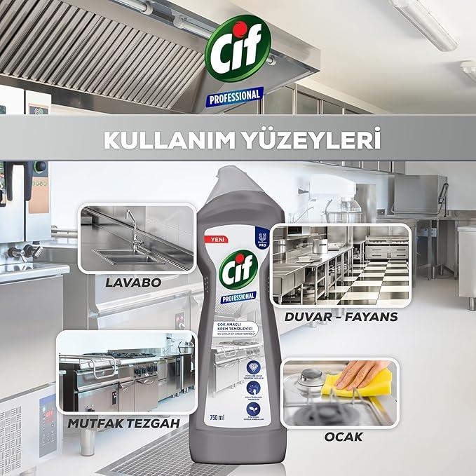 Cif Professional çok amaçlı krem temizleyici yoğun kıvamıyla yüzeylere zarar vermeden zorlu kirleri ve yağları %100 çıkarır. Özel formülüyle sayesinde kolay durulanır.