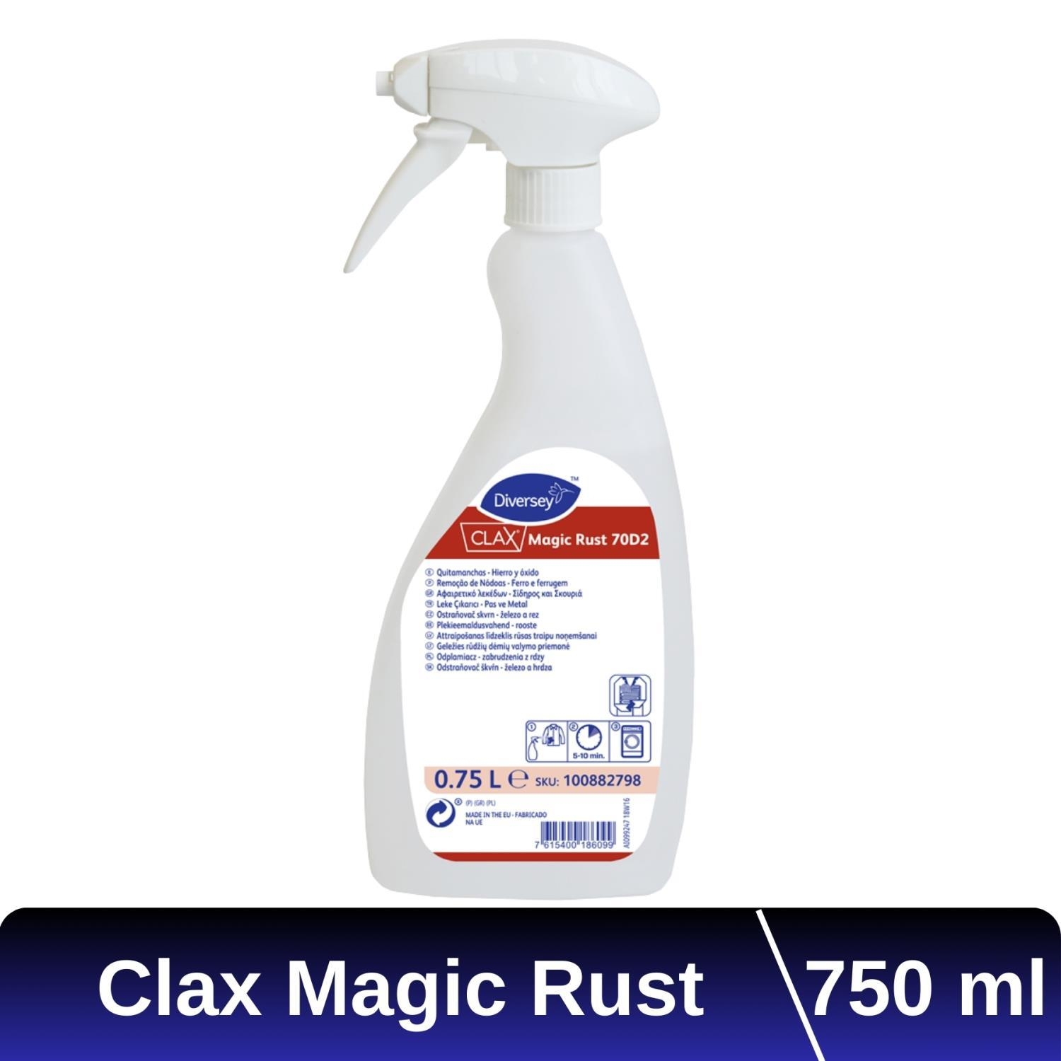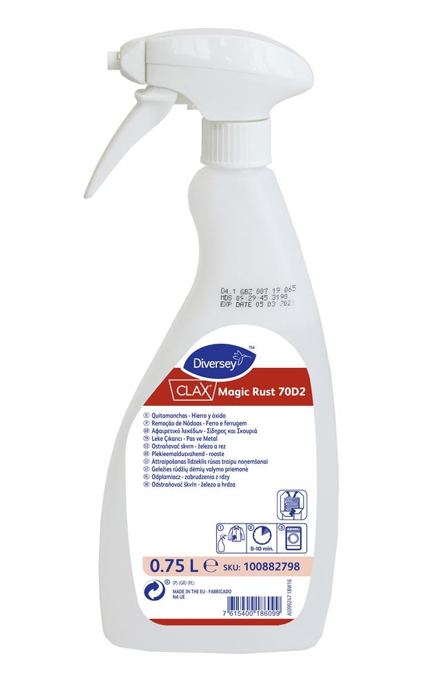 Diversey Clax Magic Rust 70D2 750 Ml, profesyonel çamaşırhaneler için geliştirilmiş, tekstil üzerindeki en zorlu lekelerden biri olan pas ve metal lekelerini çıkarmada uzmanlaşmış özel bir leke sökücüdür.