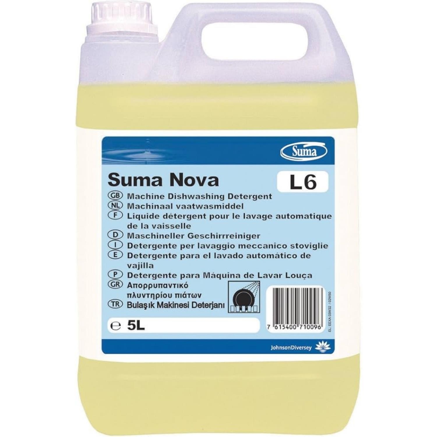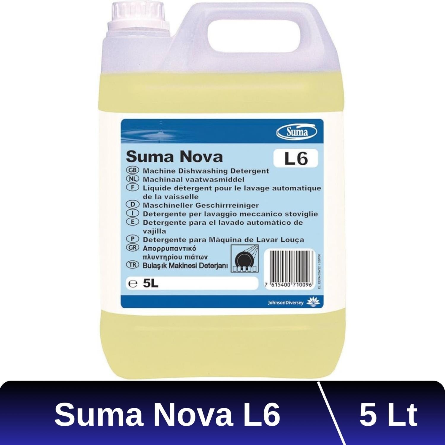 • Suma Nova L6, tek ve çok tanklı bulaşık makinelerinde kullanıma uygun ağır hizmet alkali sıvı deterjandır. Yağları ve kurumuş gıdaları gideren alkali ve kireç kontrol maddelerinin bir karışımını içerir. Yüksek seviyedeki güçlü kireç kontrol maddeleri, sert su koşullarında kireçlenmeyi de önler.
