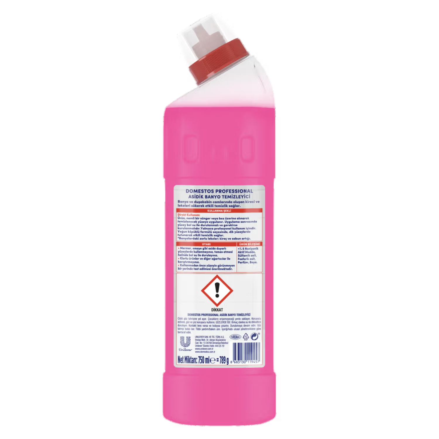 Domestos Professional Asidik Banyo Temizleyici 750 ml, banyonuzdaki en zorlu kireç lekelerini ve sabun artıklarını saniyeler içinde çözen, profesyonel güçte bir temizlik formülüdür.