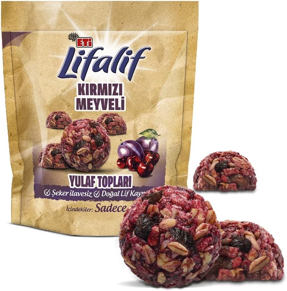 Kırmızı meyvelerden gelen mor rengi ve mayhoş tadı ile ara öğünlerine keyif katan, şeker ilavesiz tek lokmalık atıştırmalık: Eti Lifalif Kırmızı Meyveli Yulaf Topları.