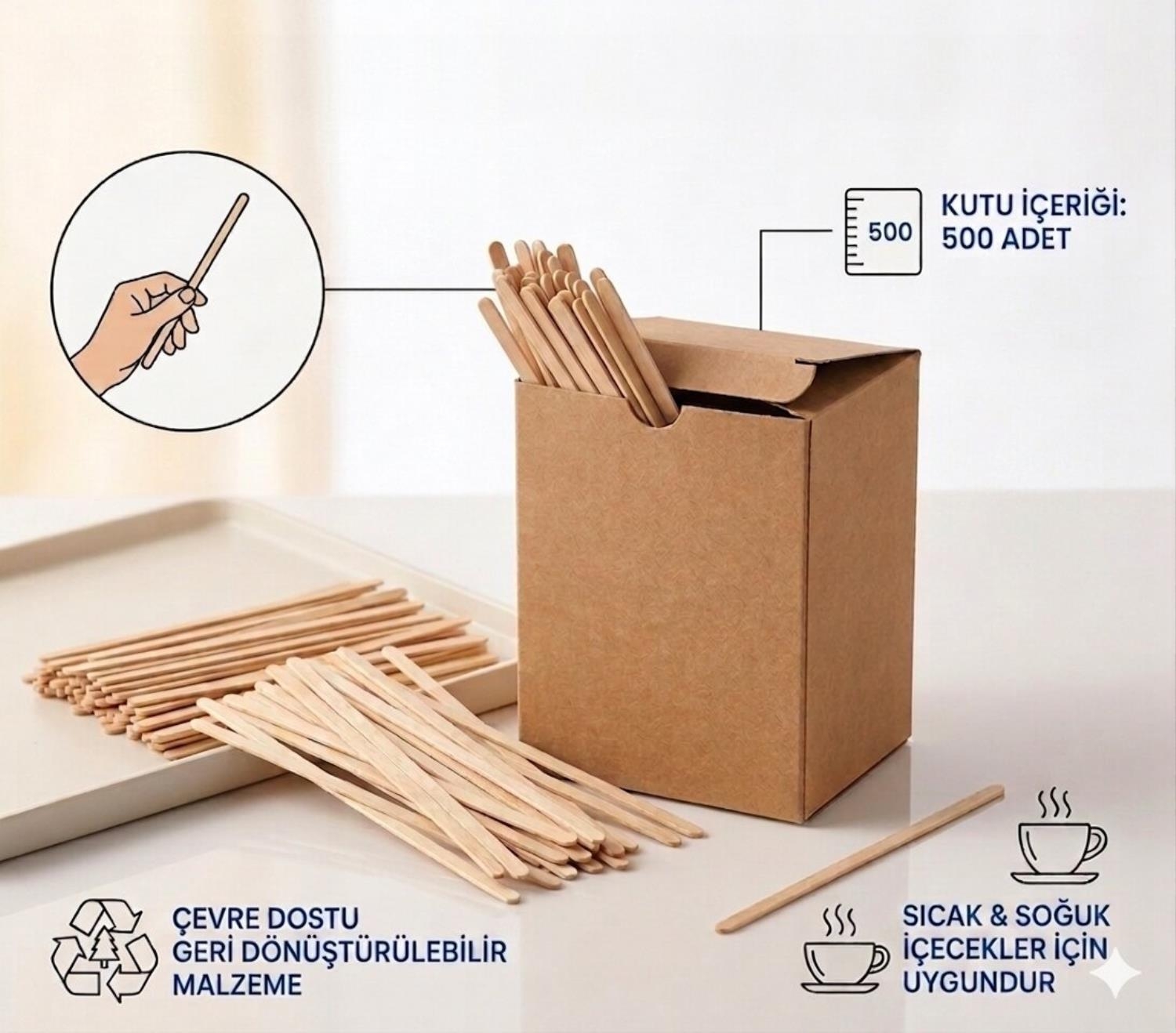 • Tahta Karıştırıcı veya ahşap karıştırıcı kavak ağacından üretilmiştir. Tek kullanımlık plastik çay kahve karıştırıcılarına doğa dostu alternatiftir.