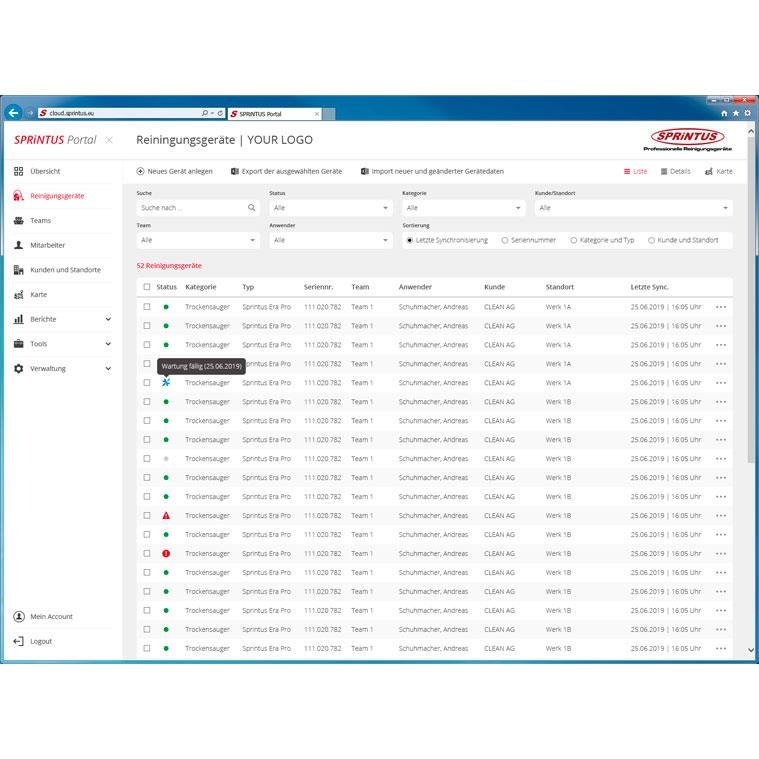 Genel bakışta, ERA PRO'nuzla ilgili tüm temel bilgiler kompakt bir şekilde gösterilir. Konum, tesis adları, kullanıcılar, günlük çalışma süreleri, BGV A3 gibi bakım tarihleri veya arızalar gibi her ERA PRO için ilgili verilere istediğiniz zaman erişebilirsiniz. SPRiNTUS UYGULAMASI üzerinden senkronizasyon sayesinde tüm veriler web portalında gerçek zamanlı olarak görüntülenir.