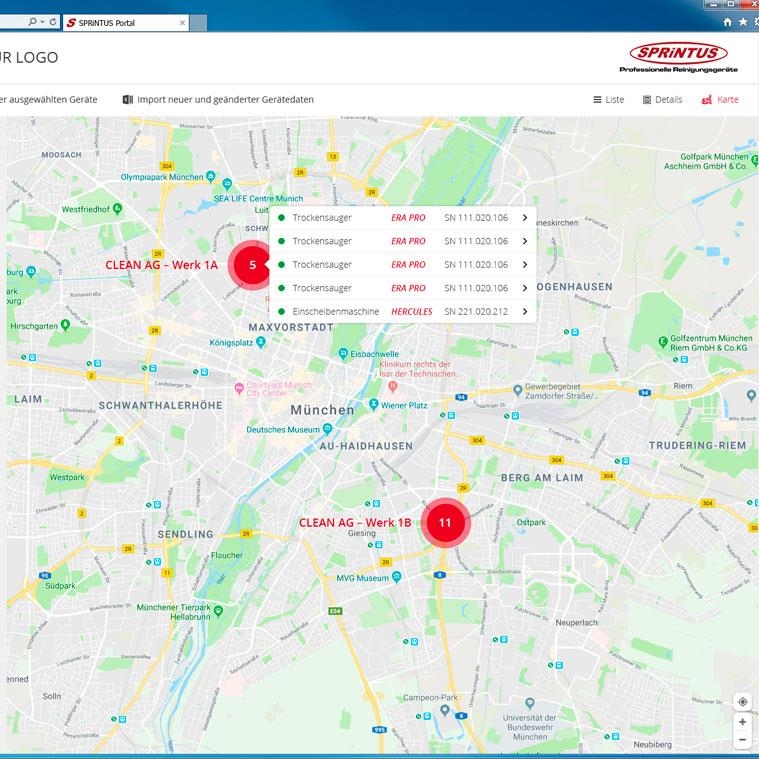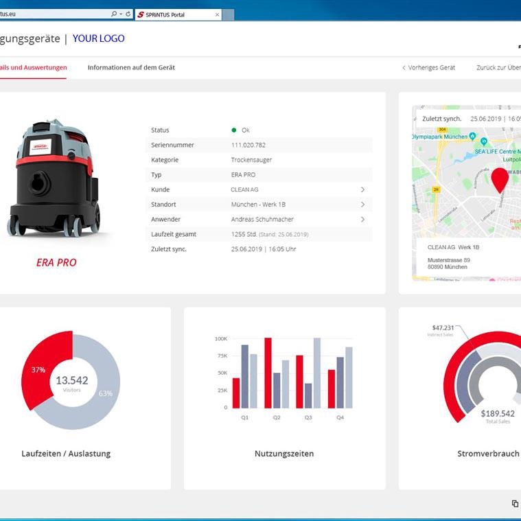 Ayrıntılı görünümde, ERA PRO'nuzla ilgili tüm ilgili raporlara erişebilirsiniz. Bu, doğru kararlar almanıza ve filonuzu optimum çalışma koşullarında tutmanıza yardımcı olur. Tesiste bulunan diğer temizlik ekipmanları oluşturulabilir ve web portalı üzerinden merkezi olarak yönetilebilir.